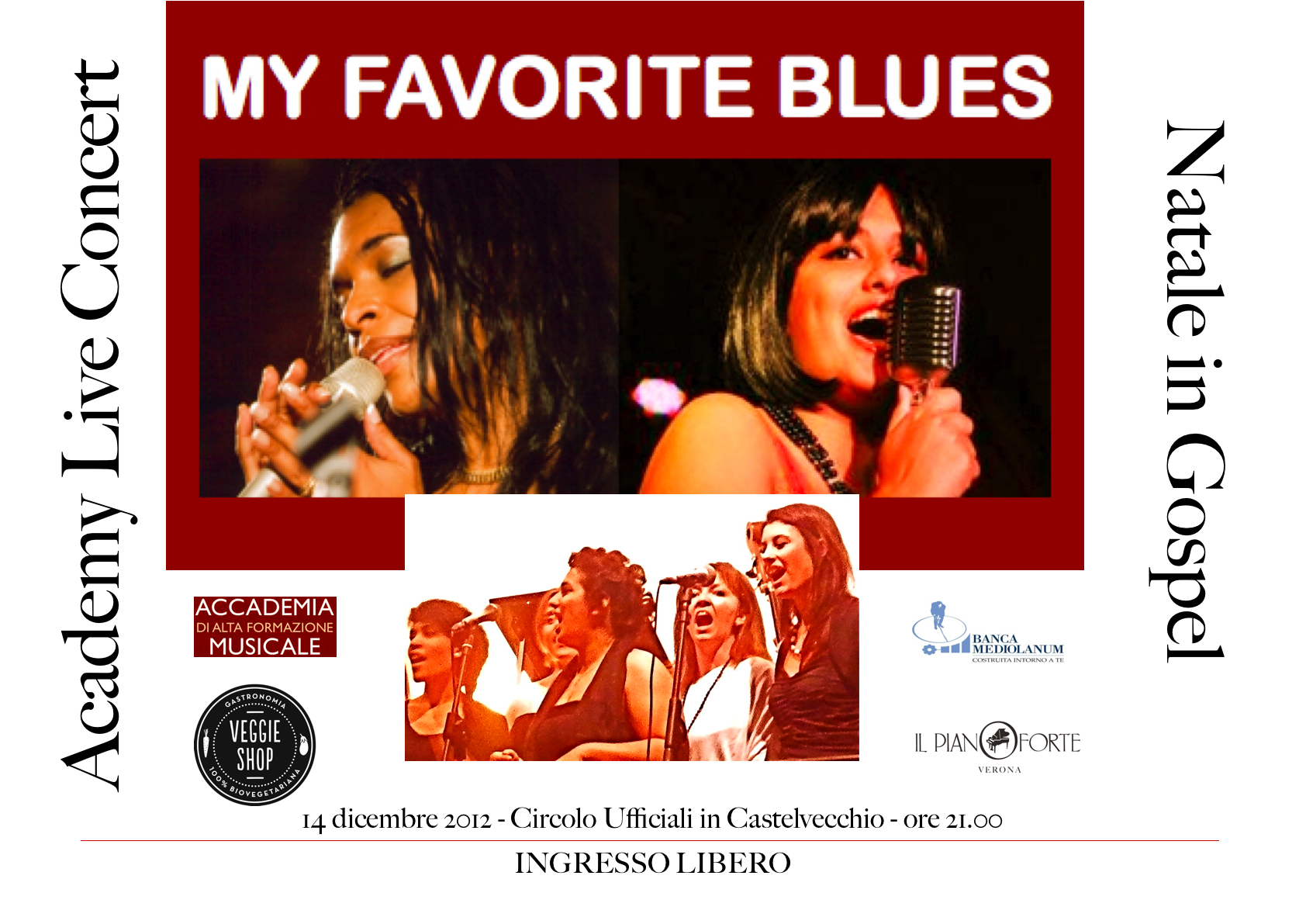 Abbiamo il piacere di invitarLa Venerdi 14 dicembre 2012 alle ore 21.00 al Circolo Ufficiali in Castelvecchio a Verona dove si terrà il concerto del MY FAVORITE BLUES – NATALE IN GOSPEL nell’ambito della rassegna Academy LiveConcert organizzata in collaborazione con il Pianoforte Verona. L’ingresso è libero e sono graditi eventuali Suoi ospiti.